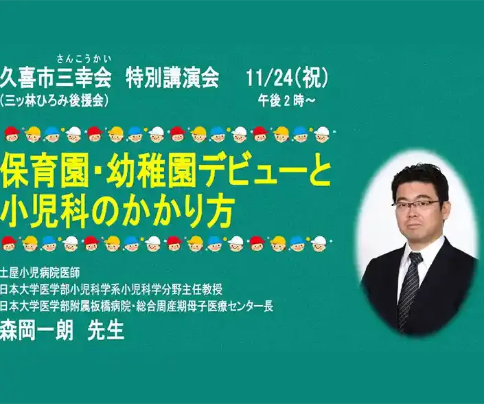 この度久喜市三幸会では、日本大学医学部の小児科教授で、久喜市にある土屋小児病院外来医師の森岡一朗先生をお招きし 「保育園・幼稚園デビューと小児科のかかり方」をテーマに講演会を開催することとなりました。